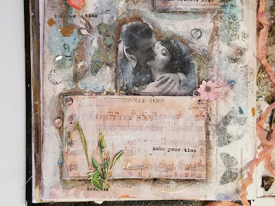 The library card and music paper is from Prima, Wild And Free I think. There are some little pressed flowers. There's Clear Rock Candy Crackle in some spots, and on the little pink hearts. I even used a couple Jo leen stickers, and a little gauze.