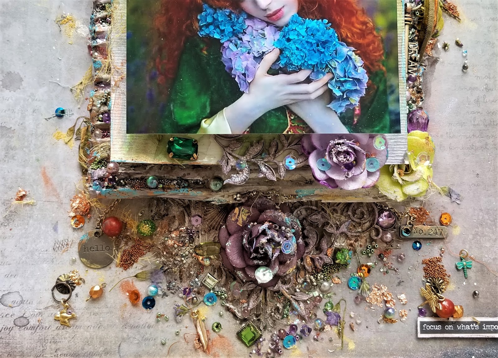 To add visual interest I added micro beads, seed beads, glass glitter,distress glitter,gold leaf,glass beads, pearls, Swarovski crystals, rhinestones,sequins, pressed flowers and leaves,pieces of floral picks,gold lace,flowers from Prima and Reneabouquets, metal from Tim Holtz,Reneabouquets, and bling and metal from my stash. The gorgeous butterfly is from Reneabouquets.